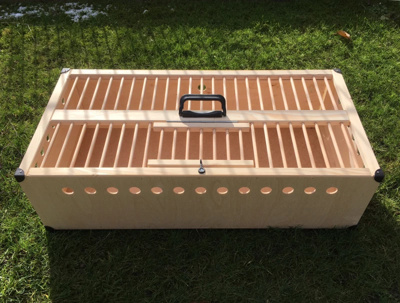 Robuster und leichter Taubenkorb mit zwei Klappen an der Oberseite, sowie einer großen Frontklappe. Der Taubenkorb ist für den Transport von ca. 12 Tauben geeignet.