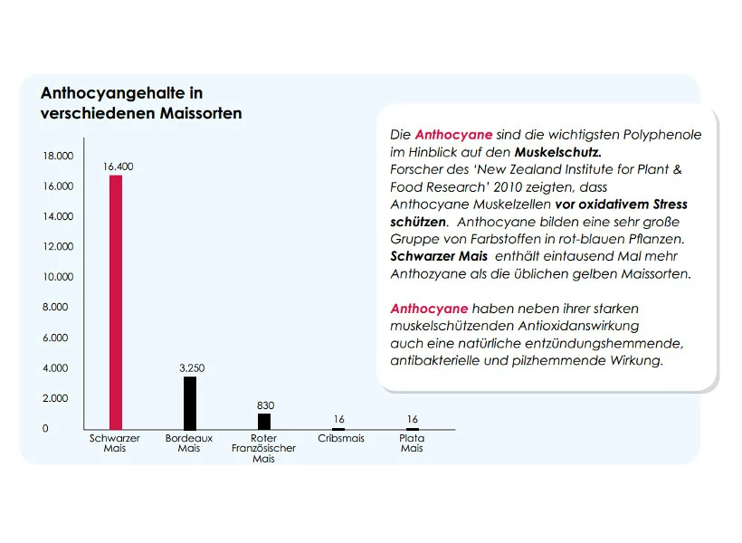 - Angereichert mit schwarzem Mais, eine sehr reiche Quelle an Antioxidantien, die für den Muskelschutz, weniger Muskelzellschädigungen und mehr Ausdauer verantwortlich sind.